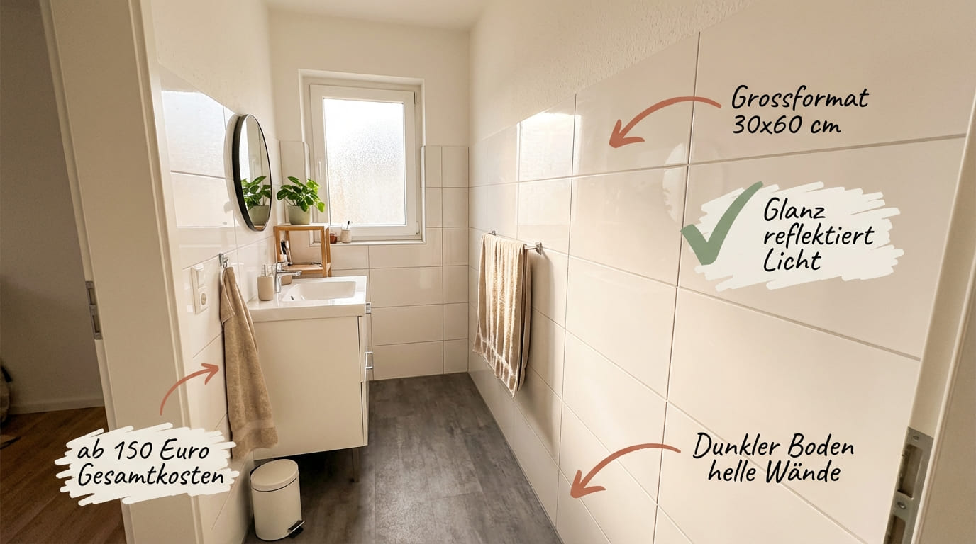 Und jetzt googelst du „welche Fliesen für kleines Bad“ und landest bei Obi, Schöner Wohnen oder Villeroy & Boch. Die empfehlen dir bodengleiche Duschen und großformatiges Feinsteinzeug für 60 € den Quadratmeter. Klingt super. Aber du wohnst zur Miete, dein Budget ist begrenzt und du willst beim Auszug deine Kaution zurück. Genau hier setzen wir an.