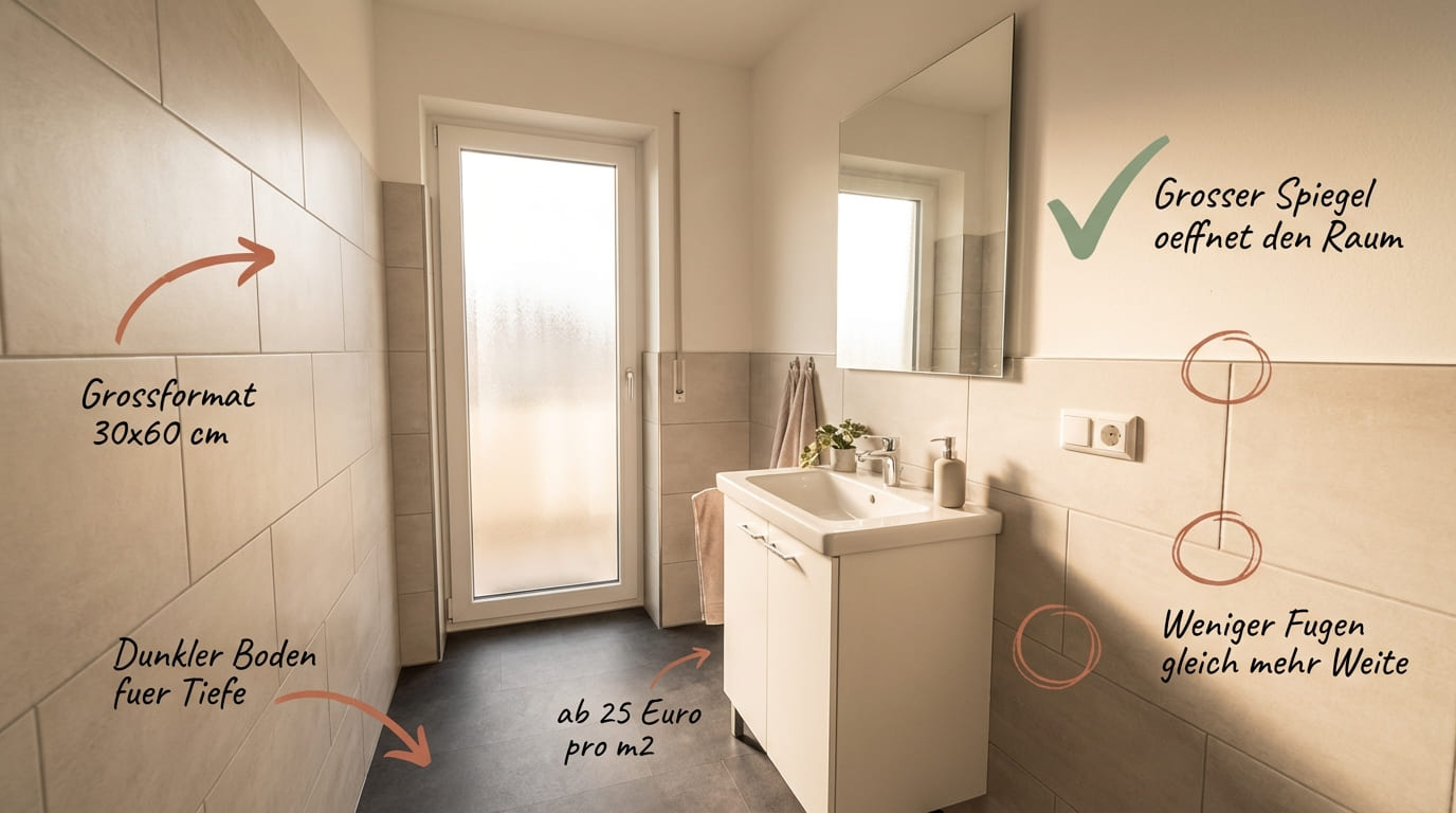 Großformat-Fliesen (30×60 cm) lassen ein kleines Bad sofort größer wirken – weniger Fugen, mehr Weite. Ab 25 Euro pro m².
