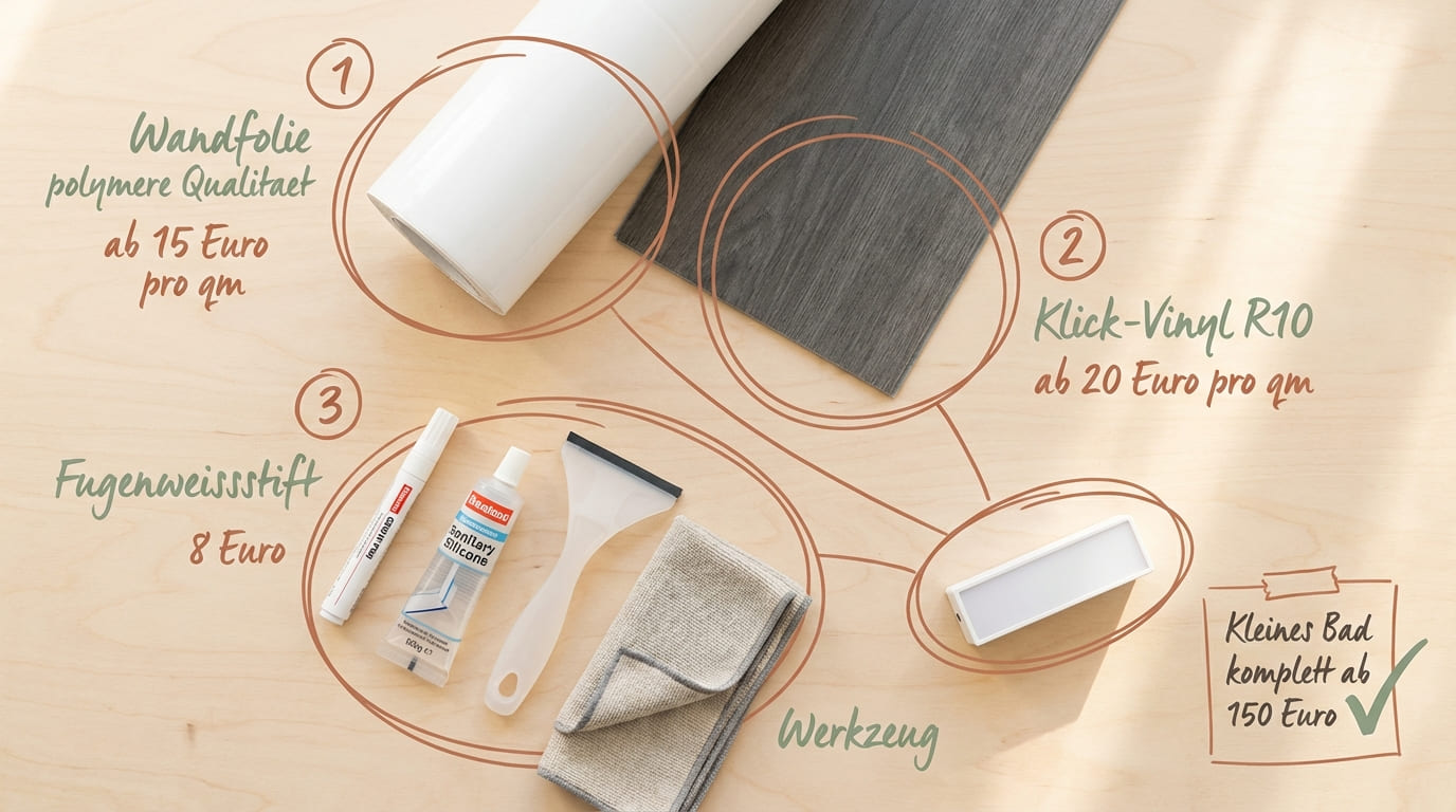 Flat-Lay mit Materialien für kleines Bad renovieren – Wandfolie ab 15 Euro pro qm, Klick-Vinyl R10 ab 20 Euro pro qm und Fugenweißstift für 8 Euro, Gesamtkosten ab 150 Euro