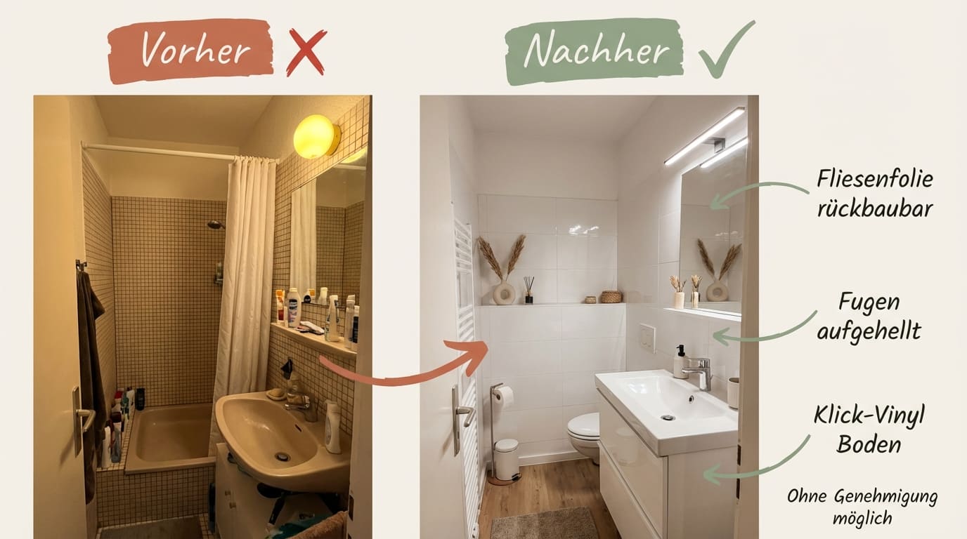 Selbstklebende Fliesenfolien für die Wände, schwimmend verlegtes Klick-Vinyl für den Boden und Fugenweißstift als Minimaleingriff. Alle drei Lösungen sind rückbaubar und budgetfreundlich.